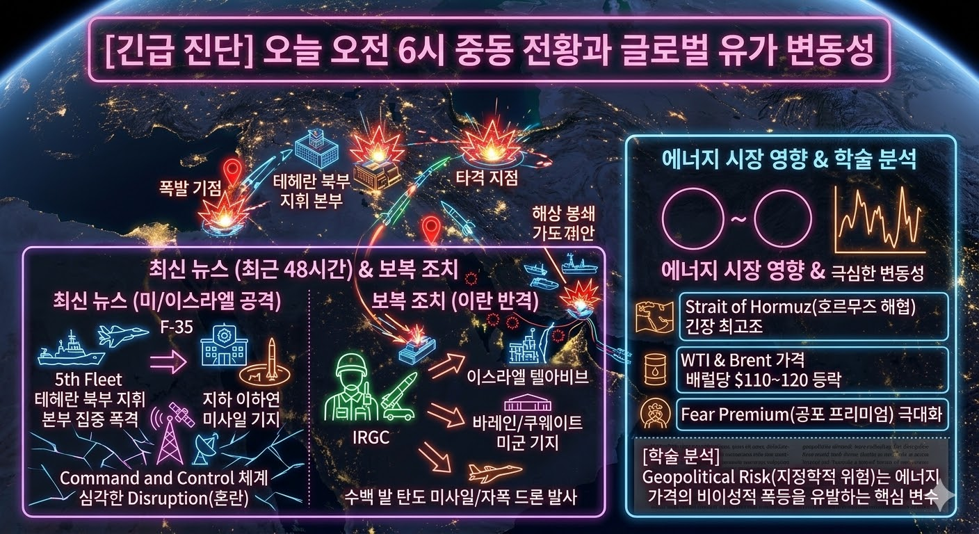 오늘 새벽 확인된 최신 뉴스에 따르면, 미 해군 제5함대와 이스라엘 공군은 지난 48시간 동안 테헤란 북부의 지휘 통제 본부와 지하 미사일 기지를 집중 폭격했습니다. 이로 인해 이란 군부의 지휘 및 통제 체계에 심각한 혼란이 발생했다는 보도가 잇따르고 있습니다. 이에 대한 보복으로 이란 혁명수비대(IRGC) 잔존 세력은 이스라엘 텔아비브와 바레인, 쿠웨이트에 위치한 미국 군사 기지를 향해 수백 발의 탄도 미사일과 자폭 드론을 발사했습니다. 호르무즈 해협(Strait of Hormuz) 긴장은 최고조에 달했으며, 이란 해군은 대량의 기뢰를 살포하며 사실상 해상 봉쇄를 시도하고 있습니다.